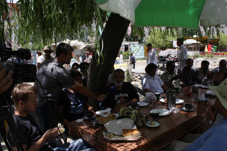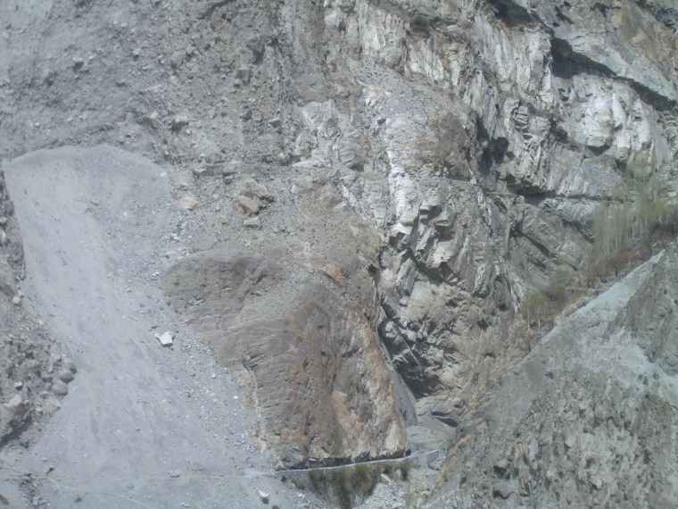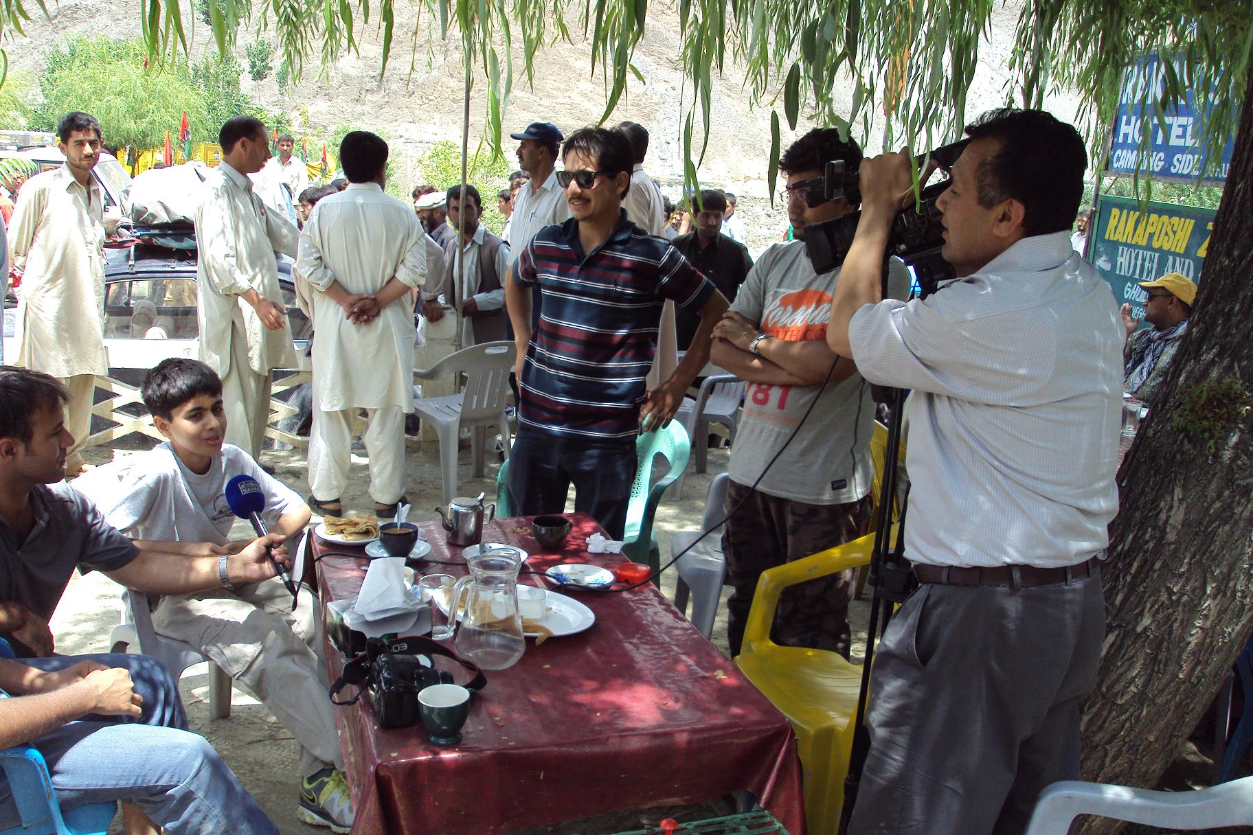 There is a lot to see and do in Hunza but we had lost a day in Gilgit due to an unscheduled stop to rest and repair the cars. The plan was to make it to Shindur for the polo finals. One of my favourite food items in Hunza is the walnut cake sold at Cafe ‘d Hunza. I could not leave Hunza without buying some. The owner found us waiting outside his cafe when he turned up. He had with him 7 walnut cakes that were still warm from the oven. We bought all. The cakes were rationed and consumed over several evening teas later. We took pictures and packed up to head back for Gilgit where we had left one of our group members. Mujahid had decided to stay back in Gilgit awaiting delivery of a pair of front struts for his super as his front tyres were rubbing against the fenders. The plan was to meet him and continue towards Shindur. Shindur would have been the first place where we planned to spend more than two nights on the entire expedition. We stopped on our way at the Rakaposhi view point which has an ideal setting to enjoy the breathtaking beauty of the 7800 m (25,740 ft.) mountain. there is a nice outdoor restaurant where you can have food while listening to the roar of water that is the snow melt from the Rakaposhi. The kitchen still employs wood stoves and ours was a large group so it took them more than an hour to bring our food. Meanwhile a TV crew turned up and interviewed us..we were going to have our 15 minutes of fame!!! When the TV reporter asked us about our plans and we told them we are heading towards Shindur he exploded the bombshell on our heads…the road is closed due to a glacial lake burst and a landslide! The first reports according to him was that the road won’t be reopened before a week, at the very least!