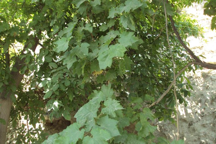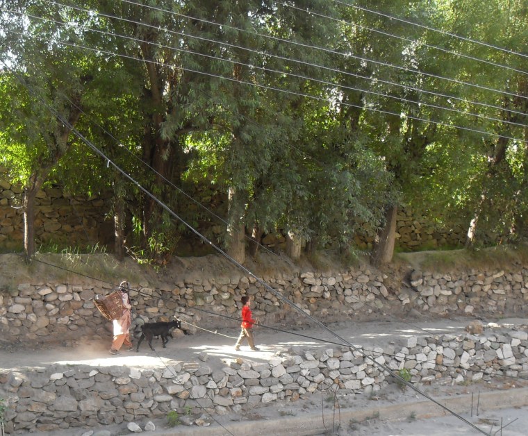 A hunza woman on her way to the field. The basket she carries is made of mulbury tree branches and would be full of produce when she returns. While she works in the field, the goat would be free to graze.