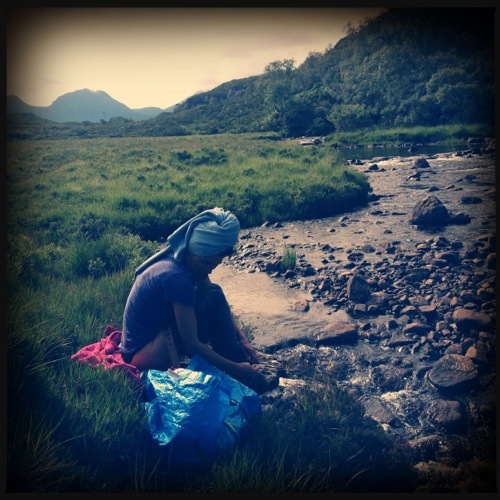 A beautiful day and heavy traffic – for Scotland’s north – welcomed us aside the single track road on that morning. As spotted the day before, there was a river and several lochs on our today’s route and combined with the warm and sunny weather – it became a perfect day for a wilderness shower or bath. We’ve found a perfect place river side, just a couple of yards away of the “heavy traffic” road and hided behind a small hill that kept our privacy in that wonderful open landscape.