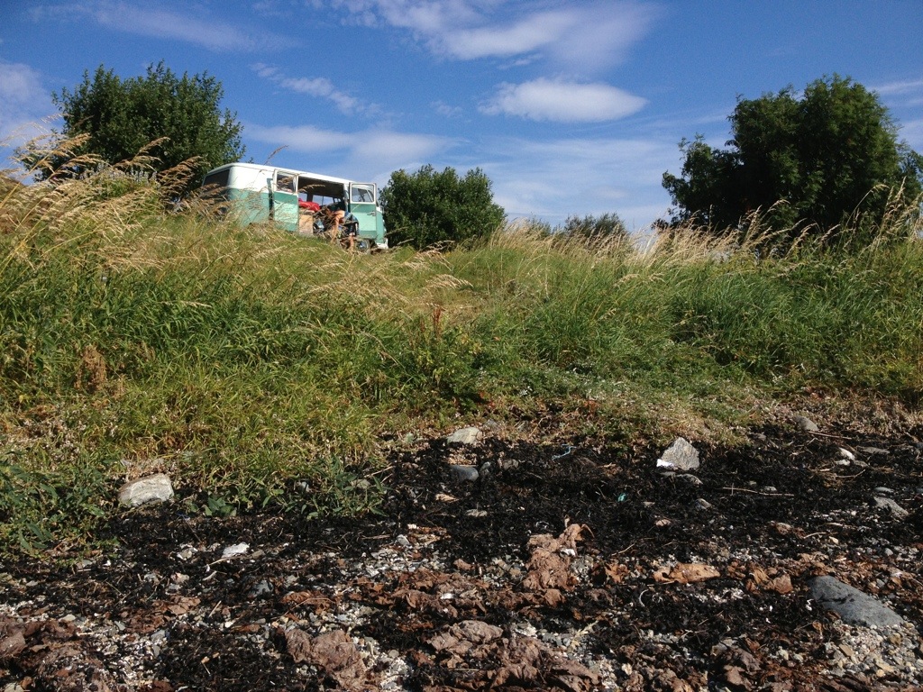 So back at the crossing we’ve choosen the next road, it was the circle road around the island. Half of the way the road became a track and we’ve had even to pay road toll – but it was worth to pay. Some kilometers later we’ve turned into a even smaller track, which seamed to lead us to the cost – Bonanza. It ends up directly on a small bay with a beach. The only bad aspect was, that there was a cabin nearby, but it was abandoned and signed as for sale. So, we’ve also canceled the visit of the beach coffee and decided to stay here for the night.