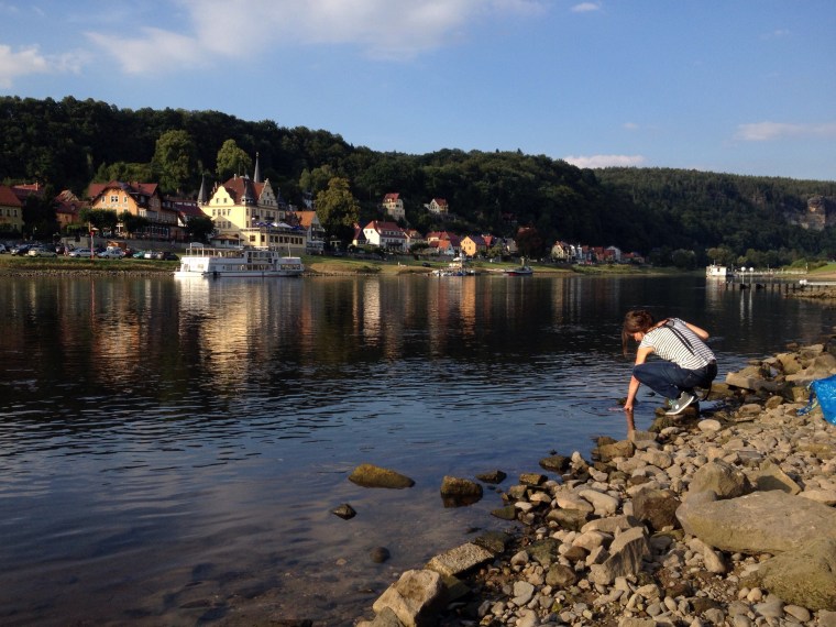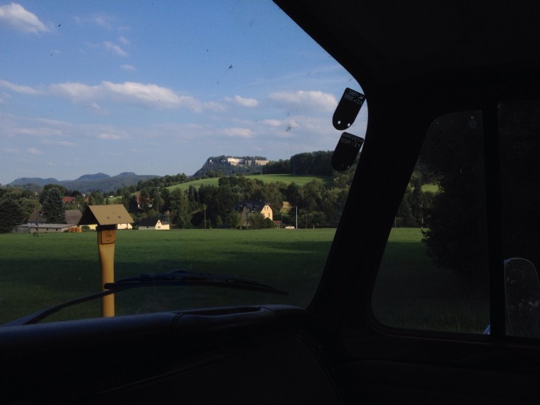 In Prina führte uns die Wegsuche quer durch die pittoreske Altstadt – da wir aber noch zur Bastei wollten, liesen wir Prina Unbesucht hinter uns. Ziel war das kleine Örtchen Raths, wo wir die Elbe queren wollten. Die Bastei war gleich gegenüber zu sehen, jedoch gabs da wiedererwarten weder eine Brücke, noch Fahrzeugfähre – was sich beim genaueren betrachten der Karte auch bestätigte. Als mussten wir die abenteurlich schmalen Strässchen raus aus dem Elbtal nochmals hochfahren, um die zwei, drei Kilometer rüber nach Stadt Wehlen zu kommen, um dort ans andere Elbufer zu kommen. Aber auch dies erwies sich als Sackgasse, obwohl auf der Karte eine Passiermöglichkeit eingezeichnet war. Da es nun endgültig zu spät für einen neuen Passierversuch an anderer Stelle war, entschlossen wir uns den lauschigen Ort und lauen Abend bei einem wärschaften Essen auf der Sonnenterrasse des Bauernhaus’l zu geniessen. Den traumhaften Übernachtungsort hatten, wir ob Raths schon vorher ausgemacht – am Waldrand mit Blick auf die Beeindruckende Festung Königstein.
